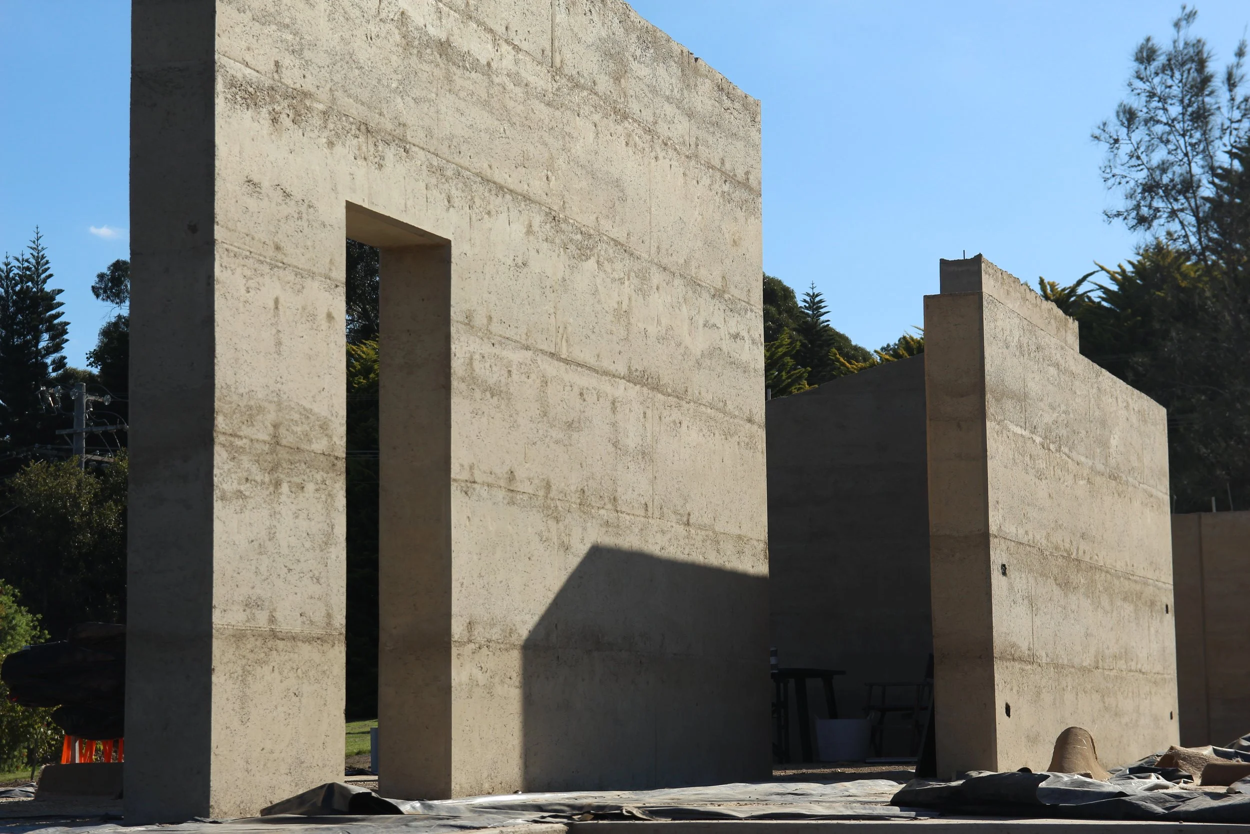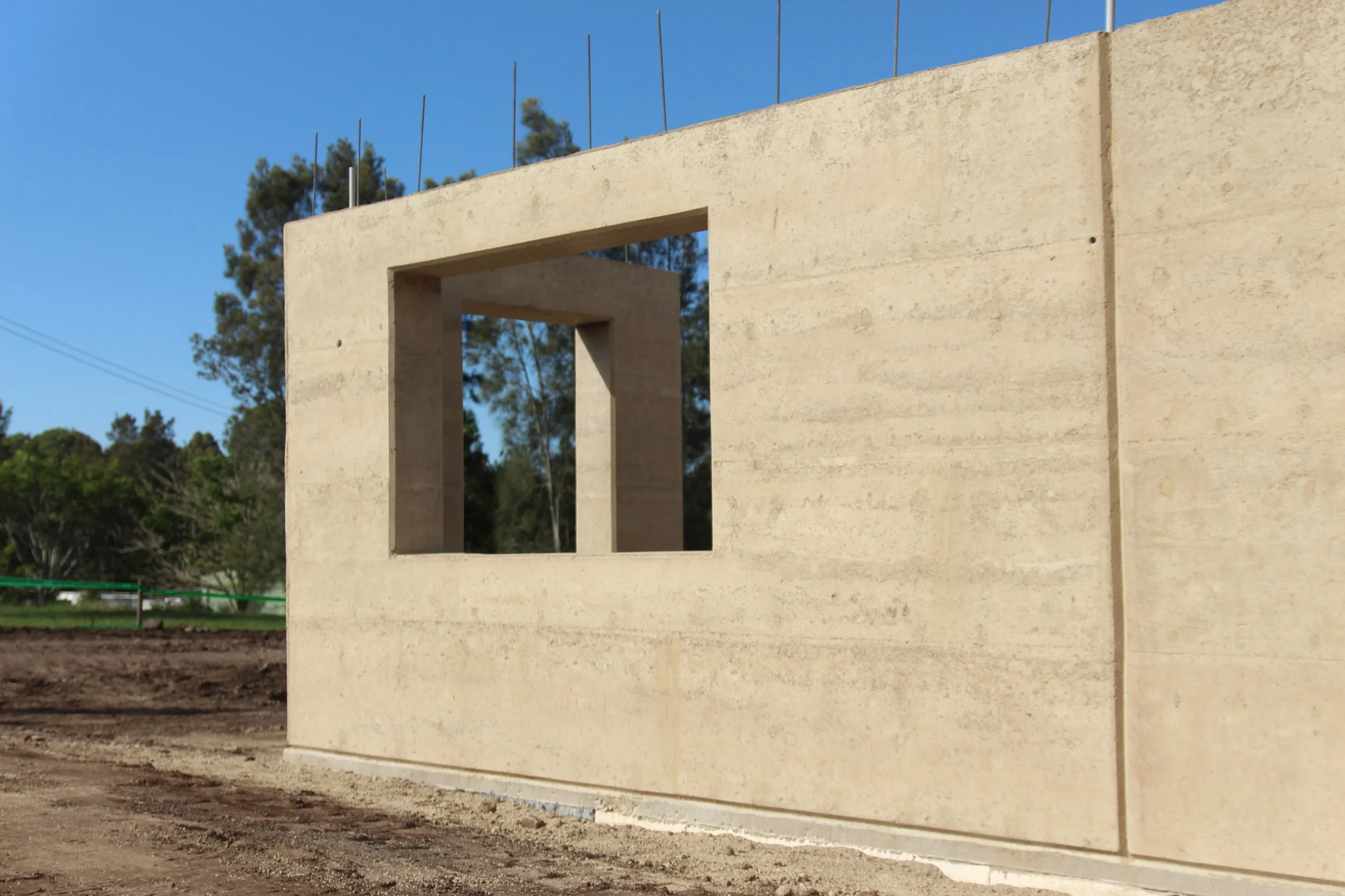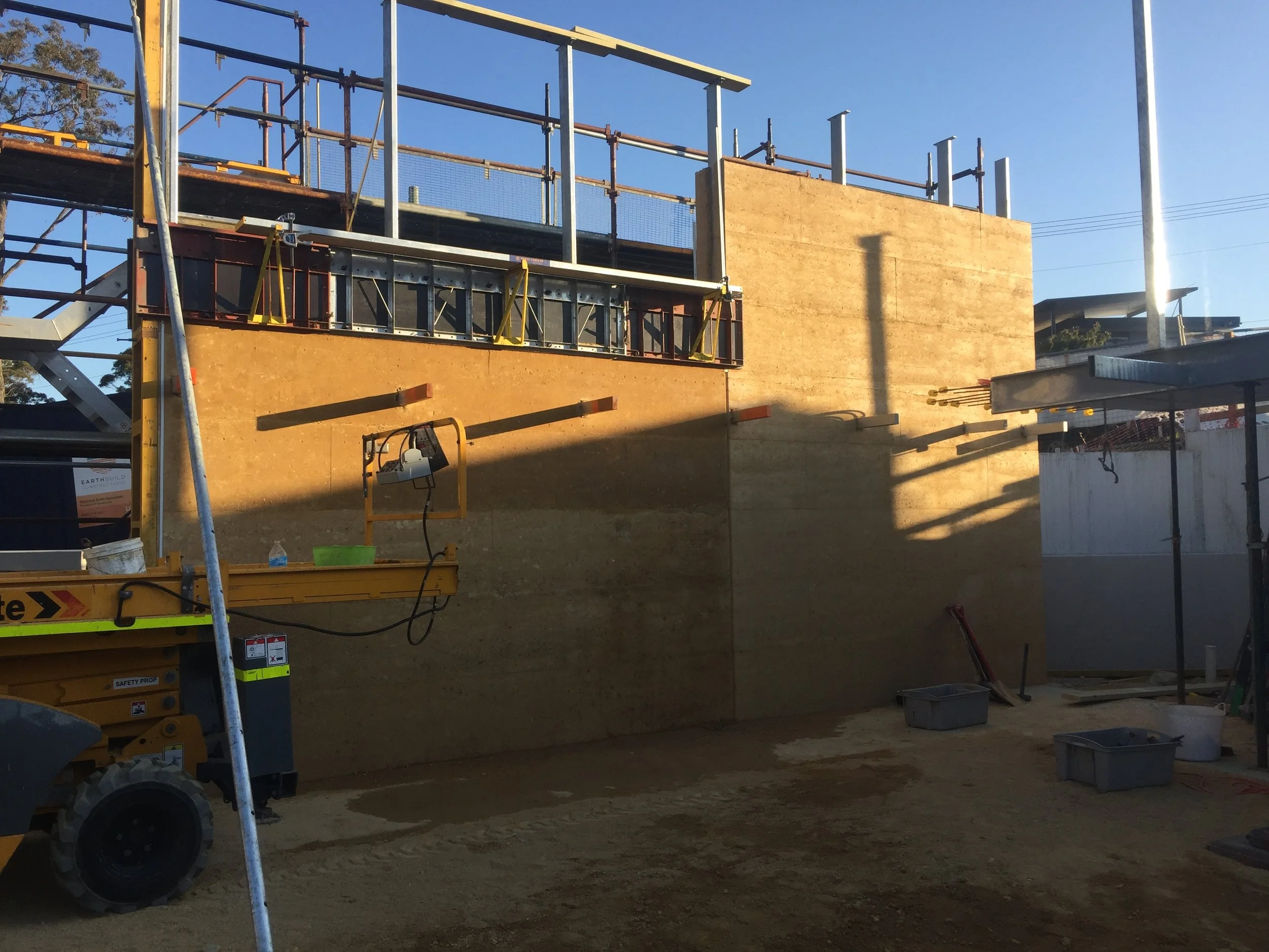 Rammed earth walls are composed of small granular size aggregates. The materials are mixed on site using a skid steer loader, where between 8-10% cement and waterproofing agents are added. The material is placed inside interlocking steel and plywood formwork and intensively compacted using air compressed pneumatic rammers. The formwork is stripped the same day revealing the finished wall.